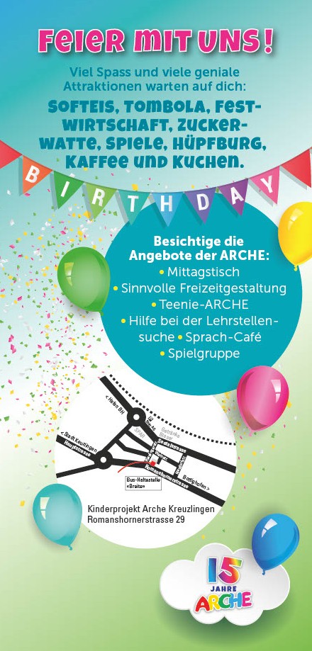 Die Arche wird fünfzehn Jahre alt – das feiern wir mit vielen Attraktionen wie Hüpfburg, Spieleparcours, Tombola und vielem mehr! Eine bunte Festwirtschaft bietet dazu die passende Verpflegung. Es gibt ebenfalls die Möglichkeit beim Tag der offenen Tür die verschiedenen Angebote der ARCHE zu besichtigen.