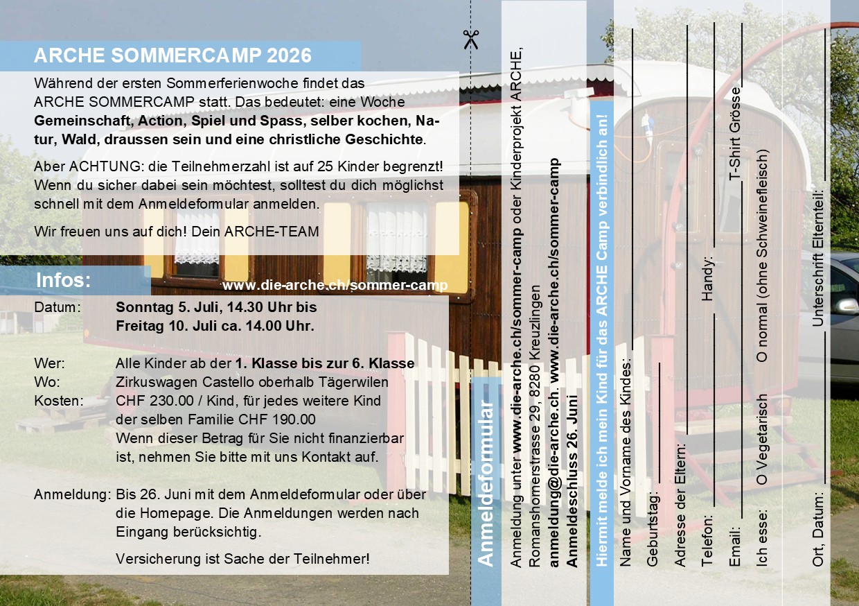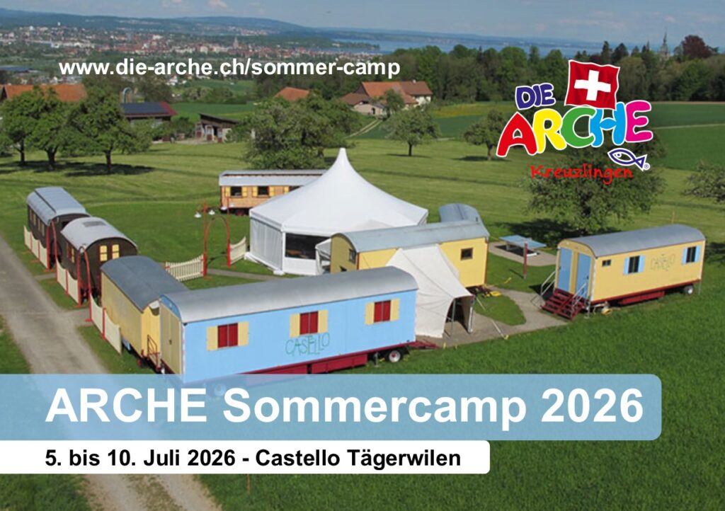 Während der ersten Sommerferienwoche findet das ARCHE SOMMERCAMP statt. Das bedeutet: eine Woche Gemeinschaft, Action, Spiel und Spass, selber kochen, Natur, Wald, draussen sein und eine christliche Geschichte hören.